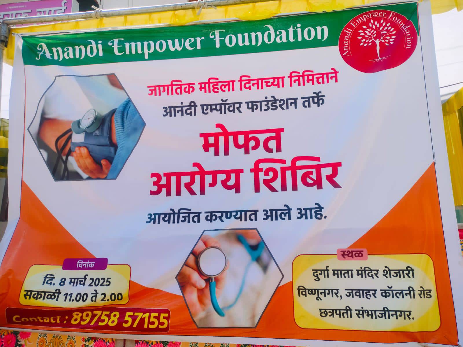 8 मार्च 2025 : आनंदी एम्पॉवर फाउंडेशन आणि रोटरी क्लब ऑफ ईस्ट छत्रपती संभाजी नगर यांच्या संयुक्त विद्यमाने 8 मार्च जागतिक महिला दिना निमित्त आज मोफत आरोग्य शिबिराचे आयोजन करण्यात आले